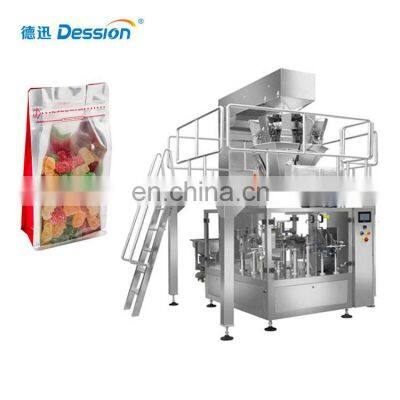 Stand Up Pouch Bear Gummy Candy Packing Machine Small Granule Premade Bag Packing MachineMachine IntroductionPackaging ApplicationThis machine can packing the liquid or paste of foodstuff, chemicals and cosmetics.Such as shampoo, edible oil, cream, tomato paste, honey, juice. etc.Details ImagesMachine WorkflowThis machine is easy to operate. Just set the parameters on the screen, and then you can start the machine. Put the product in the hopper, the machine will automatically pull the film, the bag is formed, sealed, and finally the bag is cut.Bag HolderElectronic ScaleFilling DeviceColorful touch screenDate PrinterBag SampleMachine Structure and ParametersModel NO.DS-Y-420AZDS-Y-420DZDS-Y-420LYPacking length130-420mm100-420mm100-420mmPacking width80-180mm100-300mm100-300mmPacking speed10-30bags/min18-30bags/min18-30bags/minMachine weight350KG350KG350KGMachine size635*510*1650 mm1650*510*1635 mm1650*510*2580 mmPowder220V, 50/60Hz, Single Phase Machine Characteristics1.For Stable Performance: Dual inverters controller, upgradable PLC system, self-failure diagnosis, double encoder.2.For Easy Operation: Touch screen monitor, independent temperature PID controller,3.For adaptability: one set of machine can be applicated to different kind of product via optional devices, such as air-fillingdevice, feeding line, etc.Related ProductsWhy Choose UsVR1. Professional and Strong TeamDession has a professional team that can provide customers with various packaging solutions. After fully understanding the customer's needs, we provide the most suitable packaging solution to the customer. Then start the production of the machine. We have a strong production and processing capacity, from the customized processing of accessories to the assembly and debugging ofthe machine. Finally, it is packaged and shipped, and it only takes a week to complete.2. Excellent transportation serviceAccording to the needs of customers, we can provide sea transportation, air transportation, and land transportation services, so that you can get the machine as soon as possible. Provide door-to-door transportation services.3. Timely and effective after-sales serviceChoosing us is not only buying a machine, but also our professional and timely service. 1. When the machine is delivered, we will attach a video of the installation and operation of the machine, so that you can use the machine quickly. 2. All electrical appliances of our machines have a one-year warranty, and we will replace them if they fail. 3. When your machine fails, we will have professional engineers to provide professional online after-sales service to help you solve the problem. 4. If the problem cannot be solved online, we will arrange an engineer to repair it on site within a week.Buyer FeedbackWe have 8 years of experience in foreign trade and export, and now our customers have spread to 90 countries all over the world. With our high-quality machines and professional services, we have won unanimous praise from our customers.Company ProfileDession a leading manufacturer of Packaging machine and supporting facilities, which has successfully developed more than 80 kinds of packaging machines. Dession Packaging Machine has widely applied for different fields throughout the world, such as food/ industrial food, medicines, hotel supplies, disposable goods, rubber goods, daily appliances, hardware fittings, sporting goods, toys etc. Dession has more than 8000 square meters of production plants, 5 production workshops and a parts processing workshop, including small vertical machine production workshops, vertical machine production workshops, pillow machine production workshops, cartoning machine production workshop and filling machine production workshop.FAQQ1:Do you have manual or operation video for us to know more about the machine? Yes, not only manual or operation video, 3D drawing also available to make as per your design,also the video we can make of testing the material from our packaging machine if your packing goods easier for us to find from our local market. Q2:How can I trust you for the first time business ?Please note our above business license and certificate. And if you don't trust us, then we can use Alibaba trade assurance service, guarantee your money, and guarantee your machine's on-time delivery and machine quality.Q3:Is engineer available to serve oversea?Yes, but the travel fee is paid by you. So actually to save your cost, we will send you a video of full details machine installation and assist you till the end.Q4:How can we make sure about the machine quality after we put the order?Before delivery, we will send you the pictures and videos for you to check the quality, and also you can arrange for quality checking by yourself or by your contacts in China.Q5:Will you provides the door to door service?Yes. Please offer us your final destination, we will check with our agent to see if it available, and most of the area is ok for us to clearing and sending in your countries.