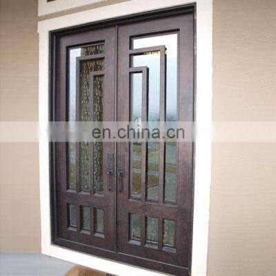 outside house decorative modern metal thermal break profile anti insect screen exterior double swing wrought iron front doorsStrong and durable structure of our wrought iron door adds security sense for your home.Product DescriptionProduction TimeReady in stock, can be shipped out at onceMaterialWrought iron/ cast ironSurface treatmentPaint..Size72 inch x 96 inch..TypeArched topGlassDouble glazed tempered Clear, frosted, Water Cube glass and so on.Opening methodSwing inward or outwardAntirust WayGalvanizing(hot dip) or zinc spraying, antirust painting.Detailed ImagesPoint 1: The jamb is fully injected with polyurethane foam. It works excellent in insulation, could create you a comfortable home environment. Point 2:The door is pre assembled lock hole, hinges,latch, essential hardware included. so you don't have to spend energy to install those hardware and save money on the installation.Point 3:The insulated tempered double pane glass equipped with window latch, can be opened independently like a window, for cleaning and ventilation.customers' orderOur iron doors are made with heavy duty material with hot dip zinc paint, they are pre hung and tested for quality assurance. Strong structureAnti rusting and Erosion resistanceSound insulation: Weather stripping arround each door and glass panel.Completed security systerm: Flush bolt system at top and bottom locks in dormant door of double door;Not matter with Railings or Windows, the handmade scrolls wrought iron door can match it perfectly. It could boost your home’s attraction and value.Inquiry to get the Catalog of wrought iron doorRelated ProductsWhy choose us1) Apex professional design team makes free drawings according to your demand. And there are newest designs from same country, such as USA, Australia and Canada, for your reference.2) The production department produces in an orderly manner, and the quality control is strictly controlled, which greatly shortens the production time.Product packagingStep 1: Soft plastic foamStep 2: Strong wooden caseStep 3: Iron boxesFAQQ1: Does all the hardware come with the door for easy installation?A: Pre assembled lock hole, hinges, latch, bolts, threshold, essential hardware included.Q2: Can we use our own design?A: Yes, we will customize it according to your demands. After you send the picture of design, we will make drawings for you till you confirm it.Q3: What shipping method will adopt?A: We ship out the door by sea, to the port closest to you. Or using your own agent is acceptable.Q4: What's the production time?A: We will start to make the production after we get deposit. Normally,it needs around 40 to 50 days for producing.Q5: What's the payment way and payment terms?A: Usually we use T/T, Western Union, Cash. You can also through Alibaba website to pay it. 30~50% deposit before production and balance must be paid before shipping.Order Process >> Back to home <<