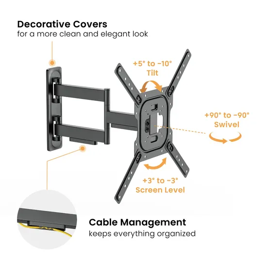 For solid wall and single stud Elevate home entertainment experience with LUMI's sleek and versatile Full-Motion TV Wall Mounts. Swivel, tilt, and extend - the LPA81-443 Full-Motion TV Wall Mount gives people the perfect viewing angle from anywhere in the room. Smooth movement brings the experience of effortless adjustment. Decorative covers for a more clean and elegant look. Cable management keeps everything organized. Installation is easy, too.