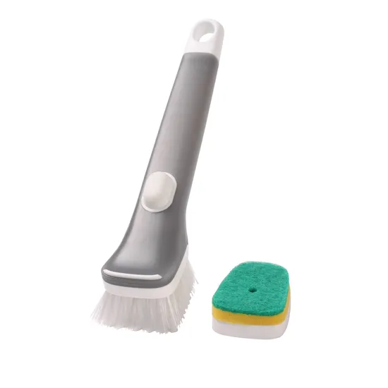 Feature | 1. The button is fully enclosed with TPR, and the liquid can be released by pressing button, which is easy to operate and smooth; 2. Changeable head design, easy to replace brush head or sponge head according to different cleaning objects. 3. 110ml large capacity liquid storage tank, transparent body design, can observe soap liquid surplus at any time; 4. The head can be cleaned and scraped to remove hard food or stains on the pot at any time; 5. Hanging design, convenient for hanging, drying and storage; |