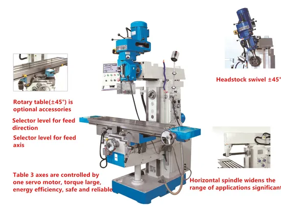 1. Finely graduated feeds in all axis, driven by servomotor 2. Horizontal spindle with large speed range, suitable for low-speed heavy load process and high-speed precision process