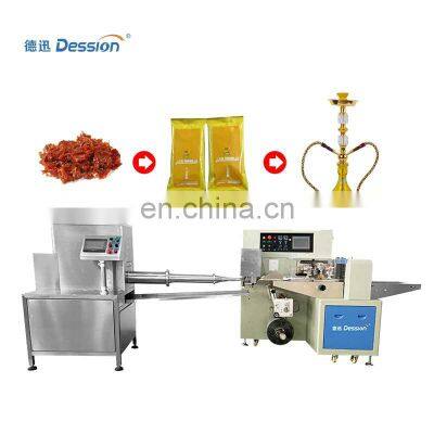 High Accuracy Pillow Bag Hookah Molasses Shisha Packing MachineDession is specialized in providing hookah packaging solutions, from filling, sealing, packaging, and full box packaging.1.Efficient: Bag-making, filling, sealing, cutting, heating, date / lot number achieved in one time.2.Intelligent: Packing speed and bag length can be set through the screen without part changes.3.Profession: Independent temperature controller with heat balance enables different packing materials; Dual inverters controller, upgradable PLC system, self-failure diagnosis, double encoder. 4.Characteristic: Automatic stop function, with safe operation and saving the film.5.Convenient: Low loss, labor saving, easy for operation and maintenance.6.Adapability: one set of machine can be applicated to different kind of product via optional devices, such as air-filling device, feeding line, etc.NameFully Automatic Shisha Horizontal Packing MachineProduct HeightMax:15mm (Height can be customized according to requirements)Packing Speed50-120bags/minutePecification of Power Supply220V,50/60Hz,2.4KWMachine Size (L)2350×(W)940×(H)1580m+(L)1980×(W)840×(H)1590mWeight1200kgRecommend ProductsOur CompanyDession is a modern packaging equipment solustion provider integrating R&D, production and sales.Since the establishment of the company, with the continuous exploration, research and application of advanced technology, the company's development has begun scale, with an innovative team of professional and technical personnel, engineers, sales and after-sales service personnel.Dession a leading manufacturer of Vertical Powder/Granule/Liquid Packaging machine, pillow packing machine and supporting facilities, which has successfully developed more than 80 kinds of packaging machines. Dession Packaging Machine has widely applied for different fields throughout the world, such as food/industrial food, medicines, hotel supplies, disposable goods, rubber goods, daily appliances, hardware fittings, sporting goods, toys etc.Dession has more than 5,000 square meters of production plants, 3 production workshops and a parts processing workshop, including small vertical machine production workshops, large vertical machine production workshops and pillow machine production workshops.CertificationsPacking & DeliveryPayment1.T/T and Western Union are accepted2.30% deposit before production and 70% balance before shipment3.All banking charges outside China are on buyersShipping1.Upon receipt of payment , delivery date will be in 15-30 working days,2.By Air, by Sea or by Express (DHL etc)3.Shipment cost will depend on the destination, shipment way and the weight of the goodsFAQQ1:Do you have manual or operation video for us to know more about the machine? Yes, not only manual or operation video, 3D drawing also available to make as per your design,also the video we can make of testing the material from our packaging machine if your packing goods easier for us to find from our local market. Q2:How can I trust you for the first time business ?Please note our above business license and certificate. And if you don't trust us, then we can use Alibaba trade assurance service, guarantee your money, and guarantee your machine's on-time delivery and machine quality.Q3:Is engineer available to serve oversea?Yes, but the travel fee is paid by you. So actually to save your cost, we will send you a video of full details machine installation and assist you till the end.Q4:How can we make sure about the machine quality after we put the order?Before delivery, we will send you the pictures and videos for you to check the quality, and also you can arrange for quality checking by yourself or by your contacts in China.Q5:Will you provides the door to door service?Yes. Please offer us your final destination, we will check with our agent to see if it available, and most of the area is ok for us to clearing and sending in your countries.