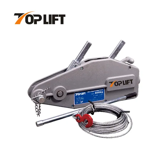 3200 KG Wire Rope Pulling Hoist 1.Forward and reversing levers in tandem provide slim design and assure power transfer along the center line. 2.Overload protection is by a shearing pin in the forward lever,Spare shear pins are conveniently located in the carrying handle or operating lever.A broken pin can be replaced without removing the load. 3.A lever disengages the rope clamp system allowing easy,smooth installation of the wire rope. 4.The parallel arrangement of the clamping system protects the wire rope by distributing the clamping forces evenly.A long rope advance per each lever stroke increases the working speed. 5.The large opening in the top of the unit allows easy cleaning:simply flush the unit with water,apply motor oil for lubrication and the puller is again ready for use.
