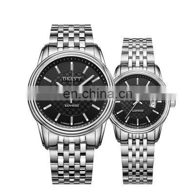 Product Description Custom Luxury Automatic Couple Watch Set Classic Business Watch With 10 ATM Water Resistant Stainless Steel Men Watches [ OEM & ODM ]General Specifications:ModelsCaseMovementAT059G/T1Stainless steelJapan movementDetailed Images Company InformationHK Dualtime watch industry Co., Ltd is a watch manufacturer build up in 2006 and passes through the certification of ISO9001. The factory area is 1400 square meters, and the annual yield is 500000pcs watches. The company owns a professional research & development team. We can do 300 meter waterproof with good quality. There are more than 2000 watch styles and more than 500 watch samples available, which include lovers series, lady series, sports series, military watch series, gentleman series, electronic series and gemstone series. Most watches are exported to Europe, America, and Southeast Asia.Packaging & Shipping Standard PackageIn general, 10 pcs are taken in a styrofoam tray.10 trays in a carton. Total 100pcs in a carton.Special Package or Custom-made Package1. If you have special requirements for packing, please let us know. Here we could give many packing ways to you.2. Custom-made boxes are available, we have great packing supplier for custom-made box.if you have gift boxes request, we could give you many designs with full support. ShippingMany friends concern about the shipping cost, normally the goods will send out through DHL, UPS, TNT, EMS, FedEx(door to door) if you do not have a domestic forwarder in China. The cost mostly depends on the final choice for the watch models, packing and shipping method, for sure we will recommend the most economic one for you.Certifications