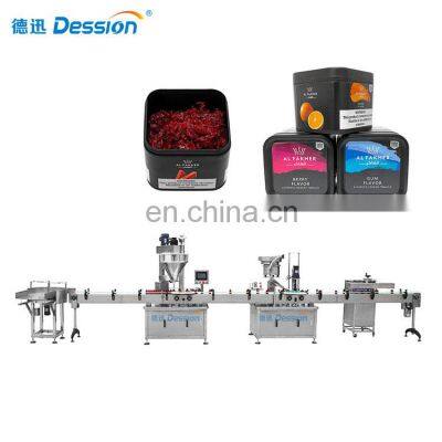 High Precision Shisha Molasses Package Machine Hookah Bottle Filling Packing MachineApplication>What can this machine pack? Specialized in providing shisha tobacco packaging solutions, from filling, sealing, packaging, and labeling.Fully automatic hookah shisha tobacco packaging line. It is a set of highly customized equipment, consisting of can unscrambling sending table, shisha metering filling machine, film sealing machine, bottle capping machine, checkweigher and labeling machine.Main Features1.Efficient: Bag-making, filling, sealing, cutting, heating, date / lot number achieved in one time; 2.Intelligent: Packing speed and bag length can be set through the screen without part changes; 3.Profession: Independent temperature controller with heat balance enables different packing materials; Dual inverters controller, upgradable PLC system, self-failure diagnosis, double encoder. 4.Characteristic: Automatic stop function, with safe operation and saving the film; 5.Convenient: Low loss, labor saving, easy for operation and maintenance.6.Adapability: one set of machine can be applicated to different kind of product via optional devices, such as air-filling device, feeding line, etc.High-precision shisha tobacco metering and filling machineThe large hopper is convenient to store materials, the high-precision screw metering device, and the packaging and filling are highly accurate.Automatic bottle film sealing machineThe fully automatic bottle film sealing machine ensures the tightness of the container and improves the storage time of the product.Automatic bottle capping machineThe fully automatic capping machine integrates lid sealing and secondary capping to ensure tightness again.Automatic bottle labeling machineThe automatic labeling machine includes two parts: labeling on both sides and labeling on the top, and the labeling effect is accurate and beautiful.Production capacity15-50 cans/minPackage weight50g (accept customized)Package accuracy50g<=±1.5g(Different materials have different actual errors)Power380V,50-60Hz 2.3KWWeight280KGSize850*1200*1800MMMaterialstainless steelSscrew capping quantitycustomizedCapping speed 15-45 bottles/minConveyor motor370W inverter motorPower1.2KWVoltageAC220V 50/60HzAir pressure0.6-0.8MPaPayment1.T/T and Western Union are accepted2.30% deposit before production and 70% balance before shipment3.All banking charges outside China are on buyersShipping1.Upon receipt of payment , delivery date will be in 15-30 working days,2.By Air, by Sea or by Express (DHL etc)3.Shipment cost will depend on the destination, shipment way and the weight of the goods