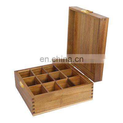 12 Compartment Acacia Wood Tea Coffee Bag Storage Box With Lock