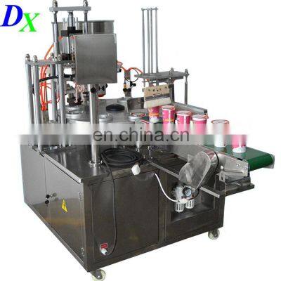 Product DescriptionRotary type Liquid water paste yogurt ice cream cup filling and sealing machineFilling material: liquid, paste, granule, powder,etcSealing Container: Cup,bottle,bowl,tray,can,jar,bucket,etcAvailable cup material: PS, PP, PE, PET, paper,etcSealing film: Roll film or Pre-cut aluminum foil Rotary type Liquid water paste yogurt ice cream cup filling and sealing machine it is widely used in many industries, like: food, daily, cosmetic, medical, and chemical.These machines are designed to denest, fill, seal, and lid your products into stackable containers.Our Rotary Filling Machines are fully automatic and is suitable for all kinds of yogurt, milk, fruit juice, spices, jam, tofu and other products.Our company can design different models in order to meet the need for the customer of different shapes and different containers.Structure of Rotary type Liquid water paste yogurt ice cream cup filling and sealing machine:--- Control system: Controller: PLC, Omron control parts.pneumatic ,to make sure the machine can operation stable.--- Seal device :heat seal ,to seal well .--- Molds :used acid proof molds .--- All the machine frame outsourcing made of 304 Stainless steelBut the filling tank and filling systerm are made of 304 Stainless steel--- Cylinder : Famous cylinder--- Electric parts : are all famous brand from all over the world.--- Filling system : piston typeMain Function of Rotary type Liquid water paste yogurt ice cream cup filling and sealing machine:Automatic cup droppingAutomatic fillingAutomatic foil suckAutomatic cut and sealing Automatic put coverAutomatic press coverAutomatic cup exitingDate printingData of Rotary type Liquid water paste yogurt ice cream cup filling and sealing machine:Machine modelPlastic cup filling and sealing machineApplicable containerWide-mouth cup,tray, bottle, box, can, container, tub, bucket, pot, etc.Filling Accuracy≤±1.5%Filling capacityAbout 900 cups/h (depends on your requried filling volume)Filling rangeCan be customizedHeating temperature0~400℃Dimension1000mm×1000mm×1750mm(L*W*H)Voltage220V/50HZPower1050WWeight200kg Process of Rotary type Liquid water paste yogurt ice cream cup filling and sealing machine:--- Falling Cups: Cups drop down one by one automatically. --- Filling: Auger filling type.--- Press: Compact product tight after filling.--- Suck Putting Lids: Vacuum arm suck and put foils on cups for cup sealing.--- Heating Sealing: Push-out finished cups to a platform.--- Pushout Finished Cups: Push-out finished cups to a platform.Cup falling device: automatic cup delivery, no need to put cup maunally.Features of Rotary type Liquid water paste yogurt ice cream cup filling and sealing machine:--- It adopts stainless steel as frame, aluminium rotary board or stainless steel rotary board..--- The food contact parts adopt 304 stainless steel material with food hygiene requirements.--- It adopts pneumatic drive and PLC control. It can automatically drop cup, fill, pull roll film, cut roll film and wasted film recycling or place pre-cut aluminium foil, heat sealing.FAQ1. How much price of your machine?We can equip machine depends on your detailed request: your filling product? cup size? volume? sealing way?etc.2. What is the material of your machine? gurantee?our machine chooses S304 stainless steel plate, not easy to rust, not easy to deform. It is suitable for all kinds of food, milk,pastes,etc.3. What is your filling machine quality?Our factory has 16 years experience in mechanical processing; all our machines already get ISO9001, SGS certificate, CE certificate; already exported into many countries and areas; already got customer’s good reputation.Packaging & ShippingPackage of Rotary type Liquid water paste yogurt ice cream cup filling and sealing machine:The whole machine material is S304 stainless steel, we normally pacakge is by plastic film, then use wooden case to pacakge machine.Our Services Company Information Gongyi Dongxing Machinery company uphold: honesty, quality first, customer first for the purpose. our aim is to supply the market with top quality machinery, and provide best service, and lowest best price for our customer.Our machines has exported many countries: Europe, Welcome visit us at any time!Rotary type Liquid water paste yogurt ice cream cup filling and sealing machine