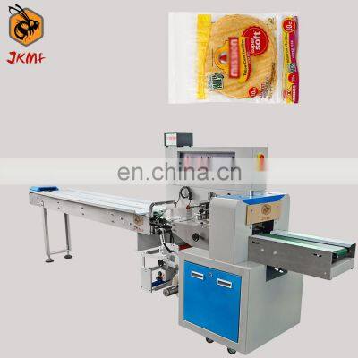 JKMF Servo Motor Corn Tortilla Pillow Packing Machine Flour Tortilla Flow Wrapping MachineProducts DescriptionThe JKMF flow packing machine features quick, easy changeover and adjustment that minimizes product and film waste and reduces maintenance costs.The machine working starts with a cylindrical roll of film. The flow wrapping machine will transfer the film from the roll and through to the forming collar (sometimes referred to as tube or plow). At the same time, a conveyor has lined up individual products for wrapping. The film is fed through the collar and the product is surrounded with film, sealed and the film is then cut. The finished individual product is then gathered downstream to be bagged or cartoned prior to boxing and palletizing.Automatic flow packing machine is a widely used packing machine. Suitable for all kinds of product packaging. Including medical supplies, vegetables and meat, baked bread, snacks and candy, daily necessities, hardware accessories, etc.Machine ParamentersJKMF flow packing machine, packaging speed is fast, the efficiency is high, the packaging process is clean and hygienic, and the operation is simple. Choose the right packaging equipment for your operation and get the highest levels of safety, shelf life, flavor retention, and appearance at every stage of production.The process of automatic bag making, date coding, labeling, weighing, and packaging is completed at one time.Main Features1.Dual frequency conversion control, Bag length can be set and cut in one step, saving time and film.2.Interface features easy and quick setting and operation.3.Self failure diagnosis, clear failure display.4.High sensitivity photoelectric eye color tracing, numerical input of cutting sealing position for extra accuracy.5.Temperature independent PID control, more suitable for packaging different materials.6.Positioned stop function, without sticking knife or wasting film.7.Simple driving system, reliable working, convenient maintenance.8.All control is realized through software, easy for function adjusting and technical upgrade.ModelJK-250XJK-350XJK-450XJK-600XFilm WidthMax.250 mmMax.350 mmMax.350 mmMax.350 mmPacking SizeL: 45~330 mmW:30~110 mmH:Max.70 mmL: 65~330 mmW:50~160 mmH:Max.80 mmL: 45~330 mmW:30~110 mmH:Max.70 mmL: 45~330 mmW:30~110 mmH:Max.70 mmPacking Speed40~230 bags/min40~230 bags/min30~150 bags/min30~150 bags/minMachine Power220V, 50/60Hz, 2.4KW220V, 50/60Hz, 2.4KW220V, 50/60Hz, 2.6KW220V, 50/60Hz, 2.6KWMachine Size3920*670*1320 mm4020*720*1450 mm3990*900*1468 mm3990*1000*1468 mmMachine Weight800 KG900 KG900 KG1050 KGMachine DetailsMachine Control CenterThe packaging parameters setting is set on the HMI screen (human machine interface). A pulse is generated for machine movement, and this is transferred to the PLC (programmable logic controller).Including packaging size, packaging speed, etc. Film Holder With Date PrinterWhen the HFFS packaging machine is operating, the film is usually pulled off the roll by film transport belts, which are positioned to the side of the forming tube which is located at the front of the machine. A date printer can be installed on the film holder, so that the production date and other information can be printed on the colleague of the packaging.Infrared Sensing DeviceThe machine adopts a three-servo induction drive system, infrared induction products, and transmits the signal to the PLC controller, and the machine automatically recognizes and judges the size of the bag.Adjustable Bag FormerThe film enters a forming tube assembly. As it crests the shoulder (collar) on the forming tube, it is folded around the tube so that the end result is a length of film with the two outer edges of the film overlapping each other. Middle Bag Heat Sealing DeviceThe horizontal seal bar, which is hot, moves forward and makes contact with the horizontal overlap on the film, bonding the layers of film together.Bag Heat Sealing Cutting DeviceA set of heated horizontal sealing jaws come together to make the top seal of one bag and the bottom seal of the next bag. While the sealing jaws are closed, the product that is being packaged is dropped down the middle of the hollow forming tube and filled into the bag.This is a complete packaging process, you will get the perfect packaging finished product.If your product needs to be filled with nitrogen to ensure the freshness of the product, then you need to purchase a set of nitrogen production equipment. In addition, our machines can also be equipped with labeling machines, date coding machines, etc. to meet your production needs.Why Choose UsJIKE BEE MACHINERY has a professional team to provide customers with various packaging solutions. Fully understanding the needs of customers,engineers design the most suitable solution. We have our own processing and assembly workshop and quality inspection and debugging process to ensure the quality of the machine. After acceptance by the customer, they are packed in international standard wooden cases and shipped.The machine has more than 10 advanced patented technologies, CE certificate, ISO9001 certification, etc.We will package the machine's instruction manual and a USB flash drive with machine operation videos together with the machine.Ensure that you can use the machine as soon as you receive it. If you have something you don't understand, our after-sales team will also help you answer in time.Our customers have covered more than 80 countries around the world.And give us unanimous praise.Company ProfileFoshan Jike Bee Automation Equipment Co., Ltd. is a manufacturer of automatic packaging equipment.We are a production-oriented enterprises focused on product innovation, factory direct sales and perfect after-sales service in one. Mainly applicable to: food, hardware, drugs, daily chemicals, pesticides, fruits and vegetables, cosmetics, other industries.The company has its own patent and product technical certification, which can bring customers high quality 