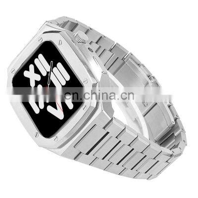 SpecificationLuxury Apple Smart Watch Stainless Steel Band Low Moq Case Watch 44mm 45mm For Apple Series 4/5/6/7 Iwatch CaseMaterialStainless SteelSize45/44 mmWaterproof10 ATMGlassMineralStrapMaterialStainless Steel/leatherWidth26-22 mmBuckleFolding BuckleSupport For Apple Series 4/5/6/7 IwatchMiyota JP25 Multifunctional QuartzDetails ImagesTransaction Flow1stDiscussion & Confirmation of Design2ndConfirmation of Down Payment3rdSample / Mass Production4thConfirmation of Balance Payment5thDeliveryPayment Term & Lead TimePayment TermSample100% pay before productionBulk30% pay before production, 70% pay before shipmentPayment Method Trade AssuranceLead TimeSampleWith Your Own LogoIf Cases in Stock30 DaysWithout LogoIf Cases in Stock3 DaysWith Your Own LogoCustomized Cases50 - 60 DaysBulkWith Your Own LogoIf Cases in Stock40 - 50 DaysWith Your Own LogoIf Cases Out of Stock50 - 60 DaysServiceOEM / ODM AvailablePacking & DeliveryFree Paper BoxA watch packed by a plastic bag, 10pcs watches packed by a paper box. Free Foam BoxA watch packed by a plastic bag, 10pcs watches packed by a foam box.PU Leather Gift BoxWe understand customers request customized gift boxes for the customized watches, as a manufacturer, we are able to offer one station service. MOQ: 500PCSIn addtion, if you have your own box supplier in China, the boxes can be sent to us for packing for free.Company ProfileHK Watch FairAs an expereienced watch manufacturer in China, Dualtime attends HK Watch Fair every time, to exhibit new designs and hot sellers, which have caught visitors eyes and help it develop customers from all over the world. Dualtime Case WorkshopDualtime focuses on high end watch, attaches great importance of quality, that's why it has self own case manufacturer, it can control the lead time and quality easily.Dualtime Dust Free Assembly WorkshopDualtime gathers some sophisticated assembly staffs, which specializes in assembling watch with complicated movements, they need to keep all watches working normally.Dualtime Quality Control WorkshopDualtime gives priority to the quality, it is vital element for the transaction. Therefore, Dualtime has different quality control teams for the incoming material, semi-finished watch and finished watch. Quality is life.Dualtime Quality Control Machines(Some of them have been uploaded as following)Waterproof Test MachineThis machine is for 1-30ATM Waterproof, to find out which ones cannot reach waterproof request level.Strap Durability Test MachineThis machine is for durability of strap, to see the straps can be folded for how many times and durability level.Shock Test MachineThis machine is for shock test, to assume that whether the hands will be loosed during transportation.Dualtime Clients Meeting Dualtime enjoys high reputation in watch field, a plenty of customers from different countries have come to visit Dualtime and their watches with joy. It is easier for us to understand each other and discuss business.If you have any interests, welcome to visit us!Dualtime Responsibility & PhilosophyDualtime has mature working systems, with sophiticated engineers, excellent designers and professional international salesman. We follow up the trend of watch fashion closely, create new and stylish designs every month. In addition, if customers have any ideas for their own watch, we can get some inspiration from their ideas and design what they need. Absolutely, design is important, but the quality is the most important, we have never made any compromising on quality, that's why we are able to win and keep long term cooperation with customers from America, Canada, Swiss, Japan, Netherlands, United Kingdom, Spain, Belgium, France, Singapore, Russia and so on.Dualtime always puts customers requirements at priority.