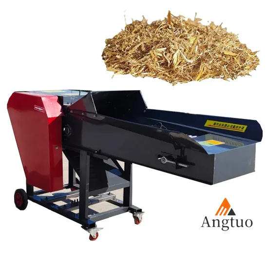 The machine cuts hay, grass, and crop residues like straw or corn stalks into small, uniform pieces suitable for animal consumption.