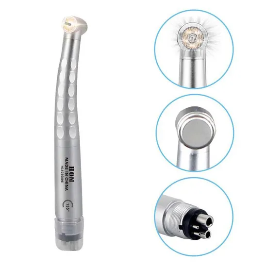 1. This high speed handpiece is used for dental surgery drilling and polishing, It is mainly composed of pneumatic turbine, rolling bearing and fuselage 2. Using shadowless technology, 360 degrees no dead angle to illuminate the mouth 3. Four holes, press, standard head 4. Spray water cooling effect is good, five water spray 5. The machine head is thickened, not easy to be broken, and the rod is antiskid 6. Adopt current limiting technology and dynamic balance technology 7. Ultra quiet, durable: each handpiece has German dynamic balance technology to ensure stable speed, accurate to each wind page, greatly extending the service life 8. Autoclavable 135°C, without deformation 9. Open movement for easy disassembly 10. The machine body adopts laser marking, unique, traceable and customized Technical Data
