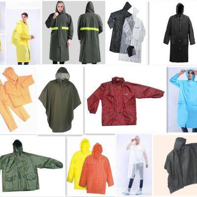 Generally the sizes are S,M,L, XL,XXL (adults and kids) and the materials are fabrics, PVC ,EVA,PEVA,Terylene and Nylon. The colors on the surface and the logo can be manufactured according to your requirements. Package: one piece of raincoat in one polybag; 10-30 pcs of raincoats in one outside carton. Of course, we also can package them according to your requirements. The price is confirmed according to your actual products and manufacturing requirements. Our MOQ: if the material is fabric, the MOQ is 2000 pcs each style; if the material is PVC and PE, the MOQ is 3000 pcs each style (they must be same styles, but can be different sizes).