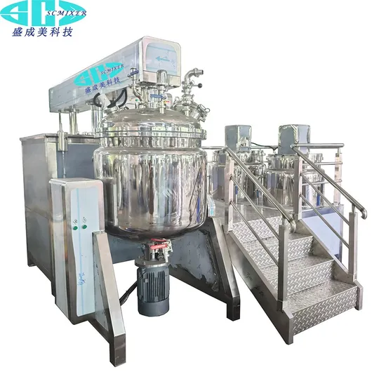 One is the scattered bigger diameter particles.The other is the air which will mix into the material during the mixing. Particles of the large diameter will lead to the labile state of the materials. If the air goes into the material, the material will be mixed with bubble, polluted by bacterium, easily oxidized and obtained an rough appearance .Regarding to these two problems, our factory-Scmixer vacuum emulsifying mixer manufacturer had developed YIF Vacuum Emulsifying Mixer which are made up of homogenizer & middle blade stirrer & scraper residues stirrer to form the best mixing way in order to produce the perfect mixed material. By extracting air from the material, the vacuum pump can ensure that the material is glossy, exquisite and ductile.