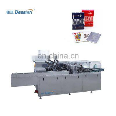 Automatic Game Card Poker Cartoning Machine Poker Carton Box Packaging MachineDession engaged in exported various filling and packing machine all over the world. Our machine widely applied for various kinds of regular objects like food, medicine, daily appliances,cosmetic,metals, industrial parts, boxes, trays, toys and etc.Box HolderBox Opening DeviceBox Sealing DeviceTouch ScreenModelDS-100APackaging Speed30-80boxes /minBox Quality Requirement250-350g/ m2 (according to customers' request)Box Dimension Range(65-200)mm* (30-90)mm* (15-60)mm (can be customized)Working pressure>=0.6mpaPower380V 50HZAir Consumption20m3/hMachine Size(L)3800*(W)1100*(H)1900mm1.Efficient: Box-filling, sealing, heating, date / lot number achieved in one time.2.Intelligent: Packing speed can be set through the screen without part changes.3.Profession: Dual inverters controller, upgradable PLC system, self-failure diagnosis, double encoder. 4.Characteristic: Automatic electronic eye detect to avoid empty box.5.Convenient: Low loss, labor saving, easy for operation and maintenance.6.Adapability: one set of machine can be applicated to different kind of product.Payment1.T/T and Western Union are accepted2.30% deposit before production and 70% balance before shipment3.All banking charges outside China are on buyersShipping1.Upon receipt of payment , delivery date will be in 15-30 working days,2.By Air, by Sea or by Express (DHL etc)3.Shipment cost will depend on the destination, shipment way and the weight of the goods