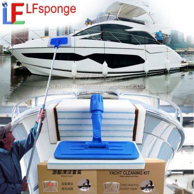 Yacht cleaning kit variety pack is a new type of boat cleaning tool, which is composed of Melamine sponge with scouring pad and melamine mop. It uses the material by 4th generation compressed melamine sponge and adopts by the microfiber technology. During the mopping process, microfiber filaments can penetrate into the tiny gaps on the surface of the hull to deeply clean stubborn dirt and repair scratches. It is simple to use, does not need detergents, and will not hurt the glass fiber/glass/plastic or painted surface. Keep your boat clean as new.