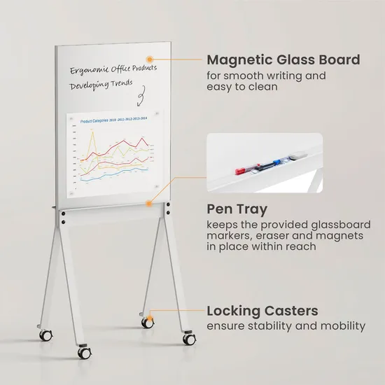 Create an Active Collaboration Work Environment Boasting a minimalist and easy-to-use design, this mobile glass whiteboard makes a perfect balance between functionality and aesthetics. Magnetic board allows for smoothly writing, easily displaying and cleaning. Built-in pen tray keeps the provided dry erase markers, eraser and magnets in place within reach. And its roll-and-lock casters ensure mobility and stability.