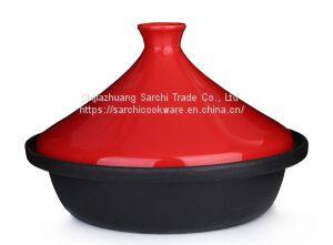 Tagine pot can minimize water loss because its triangular, conical shape allowed the steam cycle to rise. Need little water only in the cooking process, water vapor drops evenly to go up in feed material, can the original flavor that maintains food maximally and nutrition. The body of the pot is cast iron, which retains all the advantages of cast iron pots, healthy, even heating and distribution. The lid is ceramic material and with a cone shape, which makes all the steam cyclic to the pot during cooking. Size and color can be customized, we can also add your logo onto products.