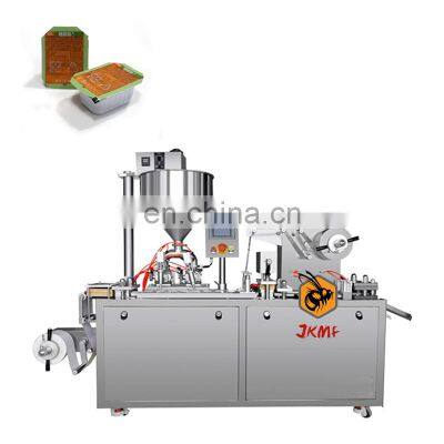 Automatic honey blister pack machine Automatique blister machineProducts DescriptionMachine InformationMachine ParametersMain Features1)Imported PLC full computer control system, color touch screen, easy to operate, intuitive and efficient.2)Impoted servo film transport system, imported color code sensor, accurate positioning, excellent overall performance and beautiful packaging.3)A variety of automatic alarm protection functions to minimize losser.4)Flat cutting, pattern cutting, linking cutting can be realized by changing the tools;easy operation with smooth bags.5)Bag-making equipment can be changed according to specific requirement of customers and products.6)Optional English or other languages screen display, easy and simple operation. Both packaging speed and bag length can be set with one click.7)All machines have CE certification and ROSH certificate.Why Choose UsJIKE BEE MACHINERY has a professional team to provide customers with various packaging solutions. Fully understanding the needs of customers,engineers design the most suitable solution. We have our own processing and assembly workshop and quality inspection and debugging process to ensure the quality of the machine. After acceptance by the customer, they are packed in international standard wooden cases and shipped.Company ProfileFoshan Jike Bee Automation Equipment Co., Ltd. is a manufacturer of automatic packaging equipment.We are a production-oriented enterprises focused on product innovation, factory direct sales and perfect after-sales service in one.The automatic packaging equipment for granule, powder, liquid and sauce produced by the Jason company is at the advanced level of the industry,it can be customized production automatic material packaging line for all kinds of products .Mainly applicable to: food, hardware, drugs, daily chemicals, pesticides, fruits and vegetables, cosmetics, other industries.The company has its own patent and product technical certification, which can bring customers high quality equipment and worthy of customer trust.Customer PhotosOur customers have covered more than 80 countries around the world.And give us unanimous praise.CertificationsFAQQ1:Do you have manual or operation video for us to know more about the machine? Yes, not only manual or operation video, 3D drawing also available to make as per your design,also the video we can make of testing the material from our packaging machine if your packing goods easier for us to find from our local market. Q2:How can I trust you for the first time business ?Please note our above business license and certificate. And if you don't trust us, then we can use Alibaba trade assurance service, guarantee your money, and guarantee your machine's on-time delivery and machine quality.Q3:Is engineer available to serve oversea?Yes, but the travel fee is paid by you. So actually to save your cost, we will send you a video of full details machine installation and assist you till the end.Q4:How can we make sure about the machine quality after we put the order?Before delivery, we will send you the pictures and videos for you to check the quality, and also you can arrange for quality checking by yourself or by your contacts in China.Q5:Will you provides the door to door service?Yes. Please offer us your final destination, we will check with our agent to see if it available, and most of the area is ok for us to clearing and sending in your countries.