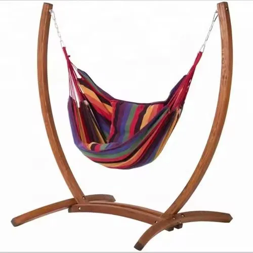 Designed to provide a comfortable and relaxing seating option, our hammock chair with wooden stand consists of a fabric chair suspended from a sturdy wooden frame and can be freestanding