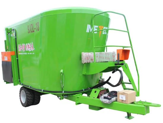 The 9JQL series fully mixed ration mixer is a vertical traction equipment. The feed mixing method adopts the form of a spiral agitator. Blades are installed on the blades to chop various hays, with low noise and less pollution. A discharge device is provided on the side of the box body. The discharge door is closed when the fixed mixer is mixing. After the feed is mixed, the discharge door is opened for unloading. There is a feeding device (customizable) on the rear side of the fixed mixer, which is controlled by a hydraulic system.