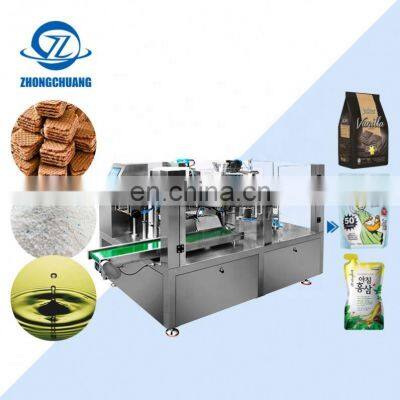 Product DescriptionStrip Vegetable Seed Auto Food And Packaging Machinery Exhibition Rotary Pouch Packing Machine Model No.ZC-D200Product Namemini doypack baby food spout pouch spoon packing machine granuleFunction Bag-feeding, Filling, Wrapping, Sealing Voltage380V 50/60hzPacking Speed 25-60 bags /minsPacking Bag SizeL: 100-350mmW : 60-200mmApplicable IndustryFood, Drink,Commodity, Medical, Chemical etcSuitable Bag TypeStand-up pouch, Zipper Bag, Film, M pouch etcDimension (L*W*H)5258*3610*3655mmMachine Surface material #304-Stainless steel Gross Weight 1300KGAir Compressed air consemed≤0.6m³ / minAccuracy ±1g (≤100g) / ± 1%( >100g) according to materialWarranty 1 year Customer Evaluation Company Information