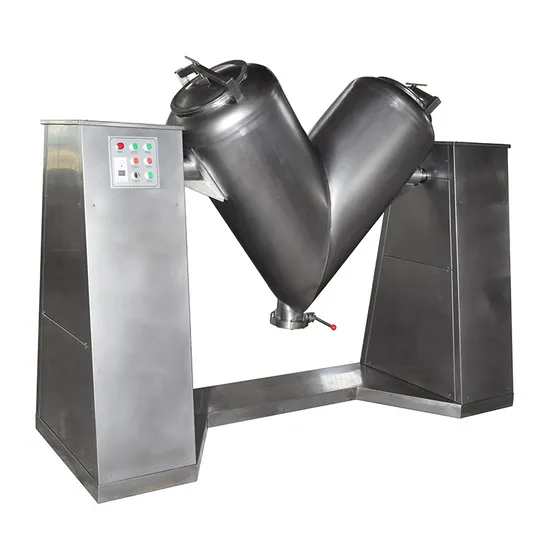 This machine has the following distinguishing features, no blind eagle in the cylinders, and no accumulation of materials, high speed, and short mixing time. With the body made of stainless steel and both inner and outer walls polished, the cylinders have elegant appearance. The charging of materials can be made either by manual operation or through vacuum suction. For discharging, rotating valves and rapid swivel heads are adopted. This mixer is applicable for mixing powdery or granular materials in pharmaceutical and other industries. It consists of two V-type cylinders of different altitudes, and through mechanical transmission the materials in these cylinders are made to move back and forth and turn over again and again, thereby achieving the goal of uniform mixing. Technical Parameters