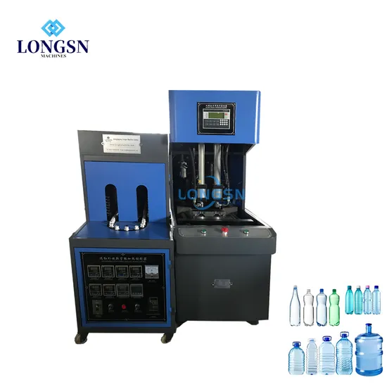 Semi automatic 2 cavity linear type plastic pet bottle blow moulding machine for sale This Stretch Blow Molding Machine is suitable to produce different shapes of PET/PC/PE bottles. It can blow from 100ml to 6000ml bottles and is widely used to produce mineral water bottles,carbonater soft drink bottles,juice bottles,medical botties,cosmetic and oil bottles etc.