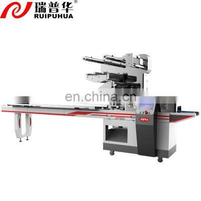 Good Quality Multi-function Automatic packaging machine wrapping machine flow packing machine for food, commodity, hardware Application This packing machine is suitable for packing foods (bread, cake, biscuit, snacks, snack bar...), commodity ( soap, disposable cutlery, diaper, disposable hotel items...)hardwares ( door/window accessories, tube, tap...) and other regular shape products. BAG TYPE *pillow bag*pillow bag with hole punch*pillow bag with euro slot*gusseted bag *continous bag We can provide custominzed service:Kindly Reminder:Please let us know the follow packing details when you offer,so that we can check if this model is suitable for your case.1. Product details2. Product dimension(L*W*H)Further information (video, pictures, technical parameter) needed, please feel free to let us know.>>Click here to send a consultation to get a discounted price! Automatic packaging machine details Standard configuration roll date coder;2.Double film support roller;3.Automatic centering device;4. Automatic film splicer. Optional configuration1.Air exhausting device;2.Different bag type device;3.Full SUS304 Machine body;4. Nitrogen filling device; Advantage of ZP-530 3-SERVO diaper packing machine Control typeEfficiencyStructureComparison Traditional packing machine Medium Mechanical-camThe error is larger than servo control when on & off, cam noise is higher. ZP-530S High Electronic-cam1. New machine frame structure, heavier and stronger.2.Menu memory function, 3.Bag length is unlimited;4. Avoid empty bag function.5. New cutter system, more precise. Technical ParameterModelZP-530(single knife)ZP-530(double knives)Packing speed35-200 bags/min35-300 bags/minBag size(L)80mm-Infinite length (W)30-160mm (H)5-55mm(L)60mm- Infinite length(W)30-160mm (H)5-50mmFilm width65-400mmPacking materialOPP/CPP,PT/PE,KOP/CPP,ALU-FOILMachine dimension(L)4300X(W)1100X(H)1600mmHeating power2.4kw3.8kwMotor power2.7kw2.7kwTotal power5.1kw6.5kwMachine weight730kg Performance and Features of ZP-530S Diaper Packing Machine (1) New structure design for machine frame, heavier and stronger.(2) Menu memory storage function, can storage groups of setting; It only needs to choose the setting name when changing products or films.(3) Bag length is unlimited. Advanced electronic cam algorithm, bag length range is from 60mm to infinite, the bag length takes effect once set, save time film in one-stop. (4) No product, no bag/ anti-cutting function. Advance electronic cutting-proof function, and electronic empty bag-proof algorithm, which can stop the film when no product, and save the film.(5) 3 servo control.Horizontal sealer, mid seal and conveyor are separately controlled by three servo motors. Simple structure, stable running and low noise. (6) High precision. The packing machine can automatic tracking product speed, and automatically accelerate and decelerate. High speed, high precision, can reach to 300bags/min with double knives , error is only ±1mm. (7) Equipped with human machine interface, make the setting easy and convenient; color mark automatically tracking function, can correct the cutting length automatically. Input numbers to set the cutting position, more precise.(8) Automatic diagnose failure, and show the failure clearly.(9) Adopt famous brand servo motor, controller and touch screen, equipped with brush in mid sealing system and end sealing system.(10) Optional device: date coder, automatic film connecting device, gas filling device, alcohol spraying device, mid-seal system heighten function, full stainless steel machine body. Our Honor We Provide fully automatic packing system About us Our Clients Why choose us? 1)Why should you choose Ruipuhua(Rapid) Packaging machinery ?Ruipuhua(Rapid) is specializing in packing machine for more than 16 years,with good quality and competitive price.2)Can you provide after-sale service?Of course,we have engineers available to service machinery overseas .3)Can I visit your factory and send workers for learning ?Yes,we will provide you with training for the workers.4)What is Our Advantages?1. Provide customized services for special requirement;2. Competitive price and reliable quality;3. Professional inspection department to guarantee quality. 5)How to Contact Us?Send your Inquiry Details in the Below, Click "Send" Now! king Machine,,Horizontal Flow Packing Machine,