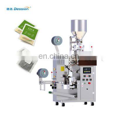 oem odm automated 10g filter making tea bag packing machine with inner outer tea bag packaging machineMachine IntroductionDession multi-functional tea packaging machine suitable for all kinds of teabag packaging.Such as bulk tea, herbal tea, health tea, flower tea, tea powder, coffee powder and other internal and external bags are disposable packaging.One machine for multiple purposes. Various packaging types are available upon request. Including tea sachet, single chamber tea bag with tag, double chamber tea bag with outer envelope.Machine ParametersModel NO.DS-T-C18MeasuringVolume measuring cupFilling Range3~15 ml(g)Packing Speed40~60 bags/minInner Bag SizeL:50-70mm,W:40-80mmOuter Bag SizeL:70-120mm,W:60-90mmTag SizeL:20-24mm,W:40-55mmThread Length155mmPower220V,50Hz,1.9KWMachine size1750*740*1950 mmMachine weight550KGMachine Characteristic1.The section where the material contact is stainless steel as the body of machine is optional for complete orpartial stainless steel and all out equipments have passed the CE Standard.2.High-sensitivity photoelectric color tracing and digital input of cutting position get more accuracy.3.Embedded sealing , enhanced structure of heat sealing intelligent temperature controller and excellent heat balance make all kinds of packaging materials possible with good performance, low noise, clear cutting pattern and strong sealability.4.Packaging speed and length of bags can be set to some extent without further adjustment and parts changing. Packaging speed and length of bags can be set to some extent without further adjustment and parts changing.Machine DeatilsThe machine is easy to operate and all settings can be controlled on the touch screen.Simply set the parameters on the screen, equip the wrapping film and install it on the machine, and the machine can be started. Put the product into the hopper, the machine will automatically pull the film, make the bag, seal, and finally cut the bag. You can get a beautiful tea bag.Machine Control CenterHuman machine Interactive interface. Easy to control and adjust. The language is customized according to customer specific requirement.Independent temperature control device for each part of the machine, easy to adjust.Measuring Cup Measuring DeviceAdopts the volumetric cup. It can be widely applied to the little granule.Not only for crushed tea.But also the coffee powder.The accurate can reach at ± 0.1.Tag and Thread Making DeviceLabels of the required size are automatically made and wired on the tea bags. If not needed, it can be turned off manually.Inner Bag Making DeviceThe corresponding bag maker can be replaced according to the size requirements.After the inner bag is made, the robot automatically picks up the finished inner bag tea bag and puts it into the outer bag device.Outer Bag Making DeviceThe whole machine adopts 3-sides heating sealing.The temperture can be easily adjusted based on different kinds of packing materials.Machine Packaging Effect DisplayThe inner and outer bags are packaged with three-side sealing. It can be equipped with nitrogen filling device and date coding device according to requirements.Why Choose UsVR1. Professional and Strong TeamDession has a professional team that can provide customers with various packaging solutions. After fully understanding the customer's needs, we provide the most suitable packaging solution to the customer. Then start the production of the machine. We have a strong production and processing capacity, from the customized processing of accessories to the assembly and debugging ofthe machine. Finally, it is packaged and shipped, and it only takes a week to complete.2. Timely and effective after-sales serviceChoosing us is not only buying a machine, but also our professional and timely service. 1. When the machine is delivered, we will attach a video of the installation and operation of the machine, so that you can use the machine quickly. 2. All electrical appliances of our machines have a one-year warranty, and we will replace them if they fail. 3. When your machine fails, we will have professional engineers to provide professional online after-sales service to help you solve the problem. 4. If the problem cannot be solved online, we will arrange an engineer to repair it on site within a week.Buyer FeedbackWe have 8 years of experience in foreign trade and export, and now our customers have spread to 90 countries all over the world. With our high-quality machines and professional services, we have won unanimous praise from our customers.Company ProfileDession a leading manufacturer of Packaging machine and supporting facilities, which has successfully developed more than 80 kinds of packaging machines. Dession Packaging Machine has widely applied for different fields throughout the world, such as food/ industrial food, medicines, hotel supplies, disposable goods, rubber goods, daily appliances, hardware fittings, sporting goods, toys etc. Dession has more than 8000 square meters of production plants, 5 production workshops and a parts processing workshop, including small vertical machine production workshops, vertical machine production workshops, pillow machine production workshops, cartoning machine production workshop and filling machine production workshop.FAQQ1:Do you have manual or operation video for us to know more about the machine? Yes, not only manual or operation video, 3D drawing also available to make as per your design,also the video we can make of testing the material from our packaging machine if your packing goods easier for us to find from our local market. Q2:How can I trust you for the first time business ?Please note our above business license and certificate. And if you don't trust us, then we can use Alibaba trade assurance service, guarantee your money, and guarantee your machine's on-time delivery and machine quality.Q3:Is engineer available to serve oversea?Yes, but the travel fee is paid by you. So actually to save your cost, we 
