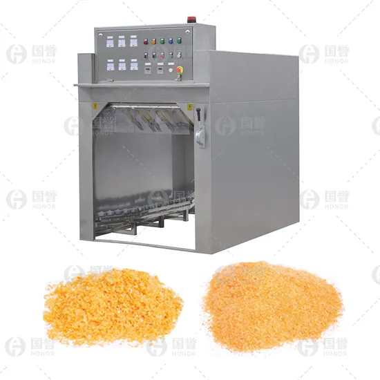 Bread crumbs (bread crumb equipment) are the coating layer on the surface of fried food. The purpose is to make the fried food crispy on the outside and tender on the inside, and reduce the loss of raw material water. With the improvement of people's living standards, the demand for foods such as meat steaks, fish steaks, chicken fillets and pumpkin pie is increasing, and the demand for bread crumbs is also increasing. Now, bread crumbs are not only used as a coating layer, but also as a food auxiliary material. Therefore, its application range is expanding day by day. Advantages comparison Bread crumbs (bread crumb equipment) can be divided into three categories, European bread crumbs, Japanese bread crumbs and puffed crumbs. European bread crumbs and Japanese bread crumbs are fermented bread crumbs with the unique aroma of fermented food. They are well colored during frying (they can show baked color and golden yellow), not easy to fall off, and the coloring time can be adjusted according to the food raw materials (for example, fried chicken nuggets and fried chicken legs require different frying times, so the coloring time of bread crumbs is also different). Puffed crumbs are not strictly speaking bread crumbs, but they are similar in appearance. They are poorly colored and easy to fall off during frying. However, due to its simple production process and relatively low cost, it has also been widely used in the market. European bread crumbs are mainly granular, with a hard and crisp taste, a chewy feel, and an uneven surface. Japanese bread crumbs have a needle-like appearance and a loose taste. Japanese bread crumbs are divided into electrode crumbs and baked crumbs according to different processing methods. Baked crumbs are a traditional production process, but due to the Maillard reaction during baking, the bread crust turns brown, resulting in a lot of waste and high cost in the production of bread crumbs. Now, the most advanced process for producing Japanese bread crumbs is electrode maturation, which is characterized by no brown crust, high efficiency, low energy consumption and high output.