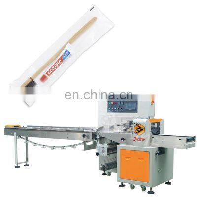 Horizontal Flow Packing Machine For Hotel Toiletries Disposable Toothbrush With Toothpaste Toothbrush Pillow Packaging MachineProducts DescriptionAutomatic flow packing machine is a widely used packing machine. Suitable for all kinds of product packaging. Including medical supplies, vegetables and meat, baked bread, snacks and candy, daily necessities, hardware accessories, etc.Machine ParamentersMain Features1.Dual frequency conversion control, Bag length can be set and cut in one step, saving time and film.2.Interface features easy and quick setting and operation.3.Self failure diagnosis, clear failure display.4.High sensitivity photoelectric eye color tracing, numerical input of cutting sealing position for extra accuracy.5.Temperature independent PID control, more suitable for packaging different materials.6.Positioned stop function, without sticking knife or wasting film.7.Simple driving system, reliable working, convenient maintenance.8.All control is realized through software, easy for function adjusting and technical upgrade.ModelJK-250XJK-350XJK-450XJK-600XFilm WidthMax.250 mmMax.350 mmMax.350 mmMax.350 mmPacking SizeL: 45~330 mmW:30~110 mmH:Max.70 mmL: 65~330 mmW:50~160 mmH:Max.80 mmL: 45~330 mmW:30~110 mmH:Max.70 mmL: 45~330 mmW:30~110 mmH:Max.70 mmPacking Speed40~230 bags/min40~230 bags/min30~150 bags/min30~150 bags/minMachine Power220V, 50/60Hz, 2.4KW220V, 50/60Hz, 2.4KW220V, 50/60Hz, 2.6KW220V, 50/60Hz, 2.6KWMachine Size3920*670*1320 mm4020*720*1450 mm3990*900*1468 mm3990*1000*1468 mmMachine Weight800 KG900 KG900 KG1050 KGMachine Working Process1st step: Put the packaging film on the holder and wear the film as required.2nd step: Setting the parameters you want by touch screen.3rd step:Put the materials to be packed on the conveyor belt4th step: The bag former will make the bag automatically.5th step: The horizontal and vertical cutter device will seal the middleand of the bag.6th step: You will get the nicely paper or plastic bag type.Why Choose UsJIKE BEE MACHINERY has a professional team to provide customers with various packaging solutions. Fully understanding the needs of customers,engineers design the most suitable solution. We have our own processing and assembly workshop and quality inspection and debugging process to ensure the quality of the machine. After acceptance by the customer, they are packed in international standard wooden cases and shipped.We will package the machine's instruction manual and a USB flash drive with machine operation videos together with the machine.Ensure that you can use the machine as soon as you receive it. If you have something you don't understand, our after-sales team will also help you answer in time.Our customers have covered more than 80 countries around the world.And give us unanimous praise.Company ProfileFoshan Jike Bee Automation Equipment Co., Ltd. is a manufacturer of automatic packaging equipment.We are a production-oriented enterprises focused on product innovation, factory direct sales and perfect after-sales service in one.The automatic packaging equipment for granule, powder, liquid and sauce produced by the Jason company is at the advanced level of the industry,it can be customized production automatic material packaging line for all kinds of products .Mainly applicable to: food, hardware, drugs, daily chemicals, pesticides, fruits and vegetables, cosmetics, other industries.The company has its own patent and product technical certification, which can bring customers high quality equipment and worthy of customer trust.CertificationsFAQQ1:Do you have manual or operation video for us to know more about the machine? Yes, not only manual or operation video, 3D drawing also available to make as per your design,also the video we can make of testing the material from our packaging machine if your packing goods easier for us to find from our local market. Q2:How can I trust you for the first time business ?Please note our above business license and certificate. And if you don't trust us, then we can use Alibaba trade assurance service, guarantee your money, and guarantee your machine's on-time delivery and machine quality.Q3:Is engineer available to serve oversea?Yes, but the travel fee is paid by you. So actually to save your cost, we will send you a video of full details machine installation and assist you till the end.Q4:How can we make sure about the machine quality after we put the order?Before delivery, we will send you the pictures and videos for you to check the quality, and also you can arrange for quality checking by yourself or by your contacts in China.Q5:Will you provides the door to door service?Yes. Please offer us your final destination, we will check with our agent to see if it available, and most of the area is ok for us to clearing and sending in your countries.