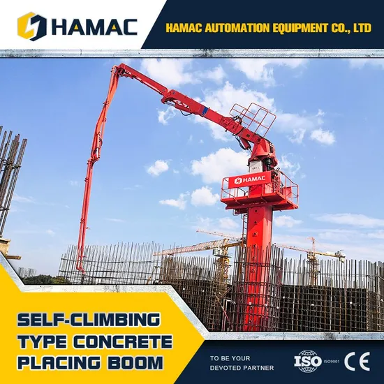 The self-climbing concrete placing boom machine is fixed in the elevator shaft and is equipped with an automatic climbing mechanism. Featuring a hydraulic self-climbing system, the placing boom is able to climb up alongside the lift shaft in the building with the rise of floor levels. The vertical reach of the placing boom relies on the performance of your concrete pump.
