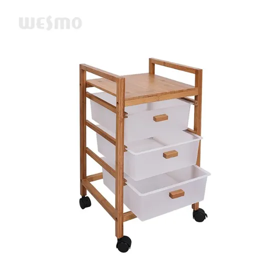 A simple trolley helps you to maximize your storage space in your kitchen, bathroom, laundry room or office. There two materials for your choice: bamboo and wood.