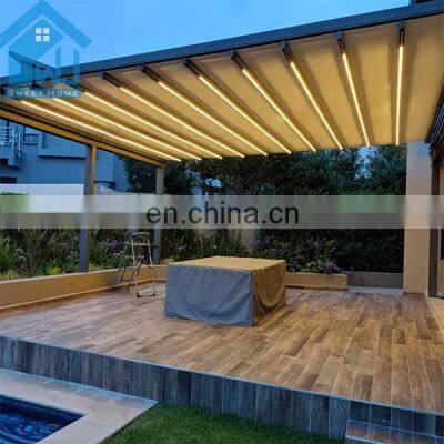 Product NameModern design bioclimatic motorized aluminium louvered pergolaControl wayMotorized with remote controlFunctionWaterproof ,sunshade,windproof ,snowproof, house space extendingApplicationVilla,balcony ,garden ,backyard ,roof ,restaurant,decking ,swimming pool and so onWind Resistant180-220 KM/HSnow Loading60-100cmSizePopular standard size:3x3x2.5、4x3x2.5、5x3x2.5、6x3x2.5 or can be customizedOther related materialsSide screen/curtains, side shutter ,LED lights,heater ,fans,glass doors,outdoor furnitureInstallationWe will provide very detailed drawing and video for the installationOthers1.MOQ:1 set, we welcome small order 2.Production: we are factory , we can provide 10-15days fast production time 3.Warrenty:10 years4.Color:White, Grey, Black, or customized colors availableFAQQ1. Is this pvc folding pergola easy to install?A: We have the assembly manual instruction specifically made according to your project site. It's a DIY product designed to be easily assembled and we can provide installation video.Q2. How long is your products' warranty?A: All our products have 10 years warranty.Q3:How to guarantee the quality of the products?A:We have our own QC team to control the products quality for all our clients'orders before loading.Q4. How can i get a price of needed pvc folding pergola?A: Please give the exactly size and quantity of your required pvc folding pergola. We can give you a detail quotation and free design solution based on your requirements.Q5.I am a small wholesaler, do you accept small order?A: It's no problem is you are a small wholesaler, we would like to grow up with you together and our MOQ is 1 set.Q6. Is my first time to export from China, what if i have no experience?A: Don t worry, we have very professional sale will guide for and we can provide one stop solution including deliver the door to your home address with customs.Q7. What kind of payment terms would you accept?A: We usually accept T/T, L/C, Western Union, etc. If you prefer other payments terms, please feel free to discuss with us.Q8. What if i meet the problem after installing and using this pvc folding pergola?A: As our principle is our business had been built on hoes & backed by customer service.we are verified supplier in Alibaba. com and our can provide 10 years warranty, so if you meet any problem for using this pvc folding pergola,welcome to contact.