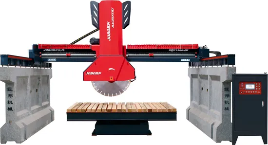 JOBORN SQC1200/1400/1600-4D Middle Block Bridge Cutting Machine. This series machine adopts microcomputer control system and human-machine interface, combined with ultra-high precision rotary encoder to locate and infrared device, uses inverter to control left-right feeding, adjusts the speed according to the stone material. It uses hydraulic lifting system, combination of chrome-plated guide pin and wear guide bush, with small gap, wearable, beautiful structure, and guide sleeve with multi-layer seals, with waterproof, dust-proof, anti-spill, improving the service life, main motor uses brand energy-efficient motor, reduces the later using cost; worktable use super heavy large size profiles welding together, larger than the table in the market, with more durable. Main parts adopt imported good-quality materials. Thus the whole machine is featured as high cutting efficiency, high cutting precision, high stability, easy-operating to suit specially cutting special-shaped stone, tombstone and curbstone.