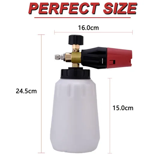 Features* Brass Foam Nozzle and core for longer working life* Thicker and heavier brass core for more dense foam* wide neck, wide base design* Multi-function adjustable spray nozzle* 34oz/1L is enough to wash two sedan cars or one big SUV* The foam cannon is used for Car, Motorcycle Washing, floors, Windows washing, Driveways, Roofs, Siding washingand so on* Filter on the end of tube, never scratch car paint