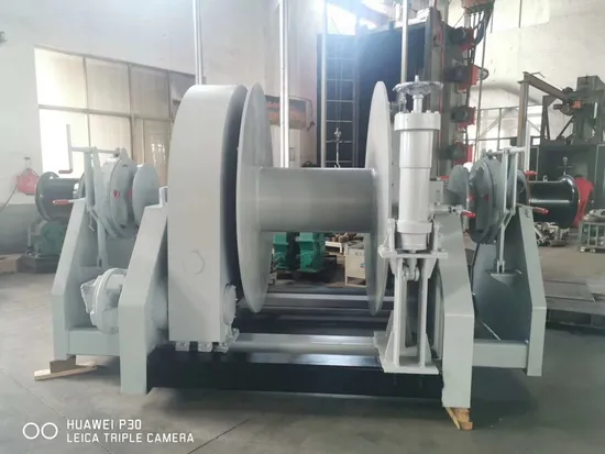 2) Hydraulic Anchor Winch with double drums in waterfall Specifications Details Hydraulic Mooring Winch with double drums in waterfall It consists of a hydraulic motor,spur gears with cover, three main shafts , two drums, ratchet wheel and detent, etc. Feature Double drums in waterfall. Two drums can work simultaneously and independently. Each Drum's load 90T (1st layer) Nominal speed 90T X 5m/min(High speed, Winch control Local control & Remote control including amplifier and joystick Brake Hydraulic operated band brake (normally shut) Clutch Hydraulic claw clutch Power Two units 90T double drums winch share one hydraulic power unit placed in a room with doors. Two winches drums can work simultaneously and independently