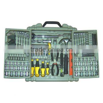 content | 11pcs 3/8" sockets,with heat treatment 28pcs 1/4" sockets ,with heat treatment 14pcs CRV nut drivers 1pc driver sockte adaptor 1/4*3/8" 1pc CRV 25mm bit adaptor 1pc 60mm magnetic bit holder 1pc spark plug socket:5/8" 1pc drive extension bar:3/8x3" 10pcs carbon steel combination wrench 16pcs carbon steel hex wrench 13pcs HSS titanium twist drills in plastic box:1.5-6.5mm 40pcs CRV 25mm screwdriver bits 5pcs CRV screwdrivers 4pcs precison screwdrivers 1pc 8OZ hammer 1pc 6" carbon steel long nose plier 1pc 6" carbon steel combination plier 2pcs lever 1pc carbon steel driver rachet handle 1pc adjustment wrench 4pcs plastic bit holder 1pc blow mold case