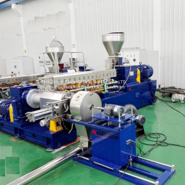 The first compounding extruder runs at a high speed for good mixing and high output capacity.The second extruder must be a larger diameter single screw one that can run at lower screw speed .The lower screw can avoid over –heating by internal cooling system and strong heat exchange ability .The functional separation allows operator to more flexibly control the expectable material mixing process and temperature.