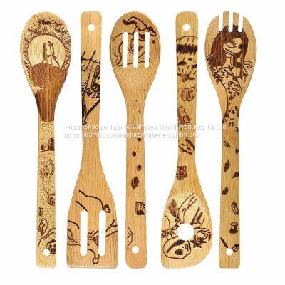 Burned bamboo cooking utensils set engraved bamboo wooden kitchen spoon set kitchenware,