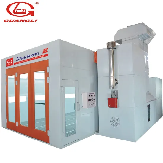 Auto maintenance paint booth equipment GuangLi Spray booth Feature Brief Description Wall panel: Sandwich style, thicken color steel sheets + fireproofing and high temperature resistance material, transverse installation, EPS for option. Basement: Steel structure with load-bearing 4tons. Intake fan: 24000m³/h air flow Exhaust fan: 24000m³/h air flow Damper converter for painting & baking: cylinder driver Heat exchange: heat resistant stainless steel, circulation heating. Burner: RIELLO /RG5S Ceiling filter: punching filter mesh installation. Top light: 10sets Side light: 8sets Control box: imported components Constant temperature spraying. Environmental system: activated carbon filter as option.