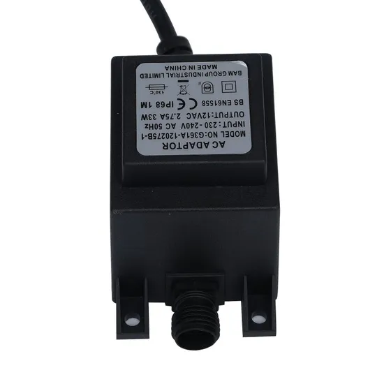 Product Features Waterproof transformers are encapsulated with epoxy resin, IP67 /IP68 waterproof grade, for Swimming Pool Lights and Pool Pumps, Garden Lights, Water Pumps, Landscape Lighting, Aquascape Pond Fountain Lighting and some LED Lamps and fixtures where contact with water is possible. Cable: Detachable (secured with a threaded cap) or non-detachable output cords Cable material: Rubber or PVC input/output cables Input Length: 1.5m to 5m, customizable. Plug Types: UK, EU, US, and AU plugs are included specific to your country. Protection: Thermal cut-out in the primary and secondary circuit Certificates: CE, ETL Input: 120VAC/220VAC/230VAC/240VAC Output: 12/24VAC Wattages: 20W, 30W, 40W, 50W, 60W, 66W, 75W, 80W, 96W, 100W Specs