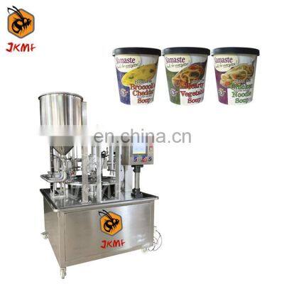 In Stock Factory Price Automatic High Speed Soup Cup Filling Sealing MachineProducts DescriptionApplicationThe rotary cup machine is fully automatic to container-loading, fill, foil-loading, seal and overlid stackable containers with reliability and accuracy. This cup filling sealing machine is equipped with PLC and touchscreen HMI, gives flexiblity to configure properly for your application. All control functions are adjustable via the menu-driven operator interface. Precision made and built to last, our cup filling and sealing machine combines innvoative features, customized for a perfect fit every time.The mold of this machine can be customized according to product requirements.The machine can be customized for filling sealing packing ice cream, yogurt, milk, soymilk, chilli sauce,juice, honey, ketchup, mineral water etc.Machine InformationHoney spoon filling machineModelJK-250HSJK-320HSPacking speed800~1000 pieces/hour1600~2000 Pieces/hourFilling volume1~20gMachine power220V/380V,50HZ,4KW220V, 50HZMachine size(L*W*H)1217*1015*13431250*1250*1650Machine weight250KG280KGMain Features1. Digital screen display with numerical setting and flexible operation.2. Imported PLC control system and color touching screen, easy operation.3. Imported film driving system and color sensor enable accurate position.4. PID independent control of temperature, more suitable for different packaging material.5. Multiple automatic alarming functions, maximum deduction the loss.6. Dual encoders enable more stable performance.Machine Working ProcessTouch Control ScreenSet the parameters on the screen, such as filling weight, speed, etc.Falling Cup DeviceSpoon drop down one by one automatically.Metering Filling DeviceAutomatically measure the required weight and fill it into the cup.Foil Film Lid StationVacuum arm suck and put foils on cups for cup sealing.Heating sealing deviceAutomatic high temperature sealing, good sealing performance.Automatic Delivery of Finished ProductsGet perfect finished cup.Why Choose UsJIKE BEE MACHINERY has a professional team to provide customers with various packaging solutions. Fully understanding the needs of customers,engineers design the most suitable solution. We have our own processing and assembly workshop and quality inspection and debugging process to ensure the quality of the machine. After acceptance by the customer, they are packed in international standard wooden cases and shipped.Company ProfileFoshan Jike Bee Automation Equipment Co., Ltd. is a manufacturer of automatic packaging equipment.We are a production-oriented enterprises focused on product innovation, factory direct sales and perfect after-sales service in one.The automatic packaging equipment for granule, powder, liquid and sauce produced by the Jason company is at the advanced level of the industry,it can be customized production automatic material packaging line for all kinds of products .Mainly applicable to: food, hardware, drugs, daily chemicals, pesticides, fruits and vegetables, cosmetics, other industries.The company has its own patent and product technical certification, which can bring customers high quality equipment and worthy of customer trust.Customer PhotosOur customers have covered more than 80 countries around the world.And give us unanimous praise.CertificationsFAQQ1:Do you have manual or operation video for us to know more about the machine? Yes, not only manual or operation video, 3D drawing also available to make as per your design,also the video we can make of testing the material from our packaging machine if your packing goods easier for us to find from our local market. Q2:How can I trust you for the first time business ?Please note our above business license and certificate. And if you don't trust us, then we can use Alibaba trade assurance service, guarantee your money, and guarantee your machine's on-time delivery and machine quality.Q3:Is engineer available to serve oversea?Yes, but the travel fee is paid by you. So actually to save your cost, we will send you a video of full details machine installation and assist you till the end.Q4:How can we make sure about the machine quality after we put the order?Before delivery, we will send you the pictures and videos for you to check the quality, and also you can arrange for quality checking by yourself or by your contacts in China.Q5:Will you provides the door to door service?Yes. Please offer us your final destination, we will check with our agent to see if it available, and most of the area is ok for us to clearing and sending in your countries.