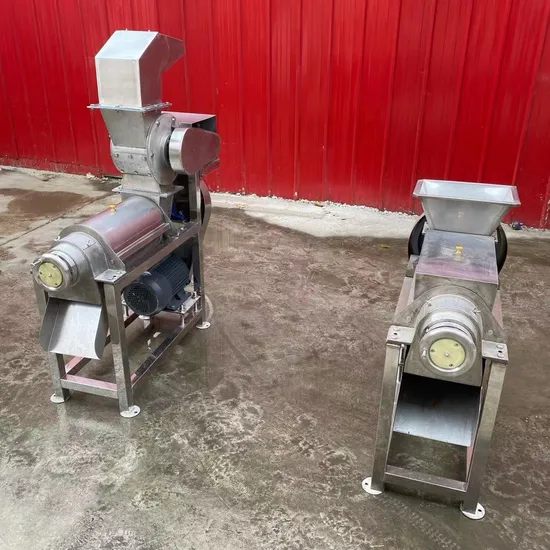 The raw material put into the hopper, spiral propels under compression, juice passes through the filter screen flowing into the juice holding device at the bottom.