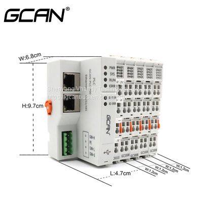 GCAN-PLC module is composed of a programmable control module (GCAN-PLC-400/510/511) and several I/O modules (GC-1008/2008/…). The control module has a variety of fieldbus communication interfaces that users can use to connect to the corresponding network and communicate with other devices.