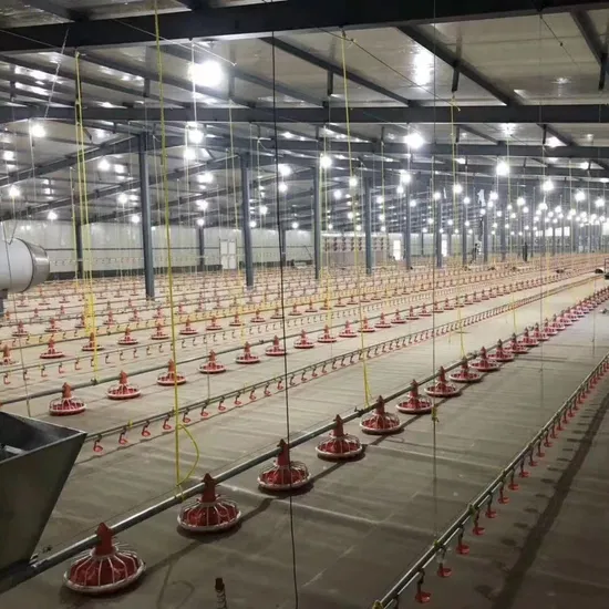 2. Pan feed line system Convey the feed in the hopper into each tray to ensure the eating of the meat chickens and automatically control the conveying opening/closing of the motor by the material level sensor to achieve automatic feeding. Pan feed system consists of: Special driving reduction motor, V-shape hopper, Feed pipe with South Africa Auger, Suspension lifting device, Anti-perching device, Germany IFM Feed Sensor.
