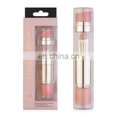 New Portable Makeup Brush Set 5 in 1 For Foundation Blusher Eyebrow Lips Cosmetics Specification:Item Name:5 in 1 Multi-Functional Makeup Brush SetModel NO.:AMB-T080Hair Material:Synthetic hairHair Color:Pink or OEMHandle Material:ABS PlasticHandle Color:Gold, Rose GoldPackaging:Color Box or CusotmizedDelivery Time:2-5 days for sample, 20-30 days for bulk orderPayment Term:T/T, Western Union, Paypal, Escrow, etcShipping Method:By Express / By Air / By Sea Features:1.5 in 1 makeup brush include Blending Sponge, Powder&Blush Brush, Eyeshadow Brush, Eyebrow Brush and Lip Brush. Provide you application of Face, Eyeshadow, Eyebrow, Lip and effortless makeup with flawless finish.2. This custom designed brush has caps on both ends for mess-free storage.3. Essential Makeup Brush Set to attend to all your makeup needs, perfect for save space in your pocket.4. Apply your favorite cosmetics in style packed away for traveling with ease. FAQQ1. Are you a trader or manufacturer? We are a professional manufacturer with more than 16 years experience in the field of makeup brushes & personal care tools,our factory located in Shenzhen city, welcome to visit us. Q2. Do you offer OEM/ODM services? A: Yes,we can offer OEM/ODM services,and can meet all your requirements,like color,material of brush hair,ferrule and handle,logo,packing,etc. Q3. What's your MOQ if I want to print my own logo? A: 500 sets for common items, 1000 sets for newly design items. Q4. Can I place a small order to check the market first? A: Yes,trial order is acceptable. Q5. Can you send samples before our order? A: Yes,samples are available,but you need to pay the sample charge and shipping cost,and we will refund the sample charge when you confirmed the bulk order. Q6. What's your lead time for samples and mass production? A: Stock samples: within 3 days; Customized samples: 7-10 days; Mass production: 15-25 working days. Q7: What's your payment terms? A: T/T, Paypal, Escrow, Western Union both available, 30% deposit,70% balance before shipment. Q8: Which shipping way is available? A: By express to your warehouse,3-5 working days; By air to your nearest airport,5-7 working days; By sea to your nearest port,15-30 working days; When the goods shipped out,we will provide you the tracking number asap.
