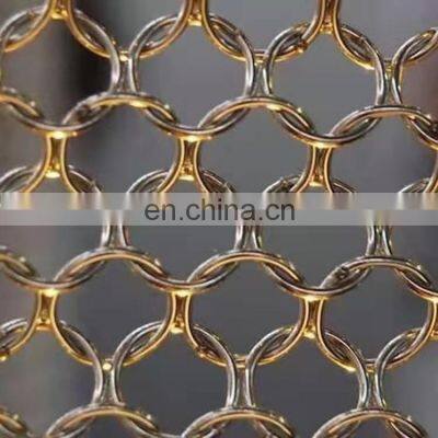 Architectural drapery brass ring mesh curtain for wall decorationRing Mesh Curtain is very popular in acting as dividers, curtains, wall background and decorative mesh for shopping malls,restaurants, and home decoration. In contrast with fabric curtains, metal ring mesh curtain gives a special and fashionable feeling. Nowadays, the ring mesh curtain/chain mail curtain has been constantly increasing prevalent in decoration. It has become a range of options for designers in the architecture field and decoration field. And it could be provided with many different shiny metallic colors applied as building's facade, room dividers, screen, ceilings, curtains and more.Product DescriptionProduct Name Architectural drapery brass ring mesh curtain for wall decorationMaterialStainless steel wire, aluminum, copper wire, brass wire, low carbon steel wireHole ShapeRoundRing Diameter (mm)From 7mm to 30mmWire Diameter (mm)From 0.7mm to 3mmLength and WidthCustomized Surface Treatment Powder coating, PVDF Coating, galvanization, anodizing, etc. Applications- Curtain Wall- Architectural cladding and decoration- Security Fencing- Balustrades- Walkways and staircases- Screens- Window- Facade cladding - CeilingPacking MethodsPacking in wooden caseQuality ControlISO CertificateAfter-sale ServiceProduct test report, online follow up. Key ParametersA: Material B: Wire diameterC: Ring SizeD: Height of the meshE: Length of the mesh F: ColorG: Need Installation Accessories or notH: Other requiements please advice usThese are only some part of our products, not all. If you need other specification, please feel free contact me. As our factory can customize the specification as your requirements.Ring types for refenrenceColors for your choice Stainless Steel Ring MeshLow Carbon Steel Ring Mesh Brass Color Ring meshCopper Color Ring MeshGolden Color Ring MeshAdvantage of Our Chain Link Curtain1. Beautiful appearance - create a visually decorative effect. 2. Mildew proof, also suitable for humidity environment. 3. Fireprevention, it is nonflammable. 4. Maintenance free-use a piece of cloth to wipe. 5. Rust resistance - no fade and long lasting. 6. Easy installation - lightweight and flexible structure. 7. Ventilation and light transmission - keep fresh air and enhance lighting.8. Various colors and sizes - can be used in different applications. 9. Unique design and style - satisfy the requests of high end customers.You May LikeApplicationsMetal ring mesh is very flexible and rollable in length, has been widely used in architecture, fencing, morden design bags or cloth. Such as curtains, space dividers, wall cladding, stage background, ceiling decoration, public architectonic art in shopping mall, Restaurant, hall, Commercial office, Hotel,Bar, Resting room, Exhibition and etc.About CompanyDONGJIE WIRE MESH PRODUCTS CO., LTDWe are a specialized manufacturer for the development, design and production of expanded metal mesh, perforated metal mesh, decorative wire mesh, filter end caps and stamping parts for decades. Dongjie has adopted ISO9001:2008 Quality System Certificate, SGS Quality System Certificate and modern management system. Production LineAnping Dongjie Wire Mesh Products Factory is founded in 1996 with 10,000sqm areas. We have more than 100 professional workers and 4 professional workshops: expanded metal mesh workshop, perforated workshop, stamping wire mesh products workshop ,molds made and deep-processing workshop.As always stuck into “Quality Proves Strength, Details Reach to Success”, Dongjie has achieved highly acclaim in the old and new customers.Packing&DeliveryQuantity(sqm)Delivery TimeShipping WayShipping Time1-3003-5 days after received your paymentDoor to door by express5-10 days300-5005-10 days after received your paymentDoor to door by express5-10 days500-100010-15 days after received your paymentShipping by airShipping by sea20-30 daysFAQQ1: Are you a manufacturer or a trader? A1: We are a professional manufacturer of chain link curtain wire mesh products. We have been specialized in wire mesh for decades and accumulated rich experiences in this field. Q2: How to make an inquiry of Chainmail Ring Wire Mesh?A2: You need to provide material, mesh size, ring size, wire diameters and the quantity to ask an offer. You can also indicate if you have any special requirement.Q3: Could you provide free sample? A3: Yes, we can provide free sample in half A4 size together with our catalogue. But the courier charge will on your side. We'll send back the courier charge if you make an order.Q4: How is your Payment Term? A4: Generally, our payment term is T/T 30% in advance and the balance 70% against the copy of B/L. Other payment terms we can also discuss. Q5: How is your delivery time? A5: ①We always prepare enough stock material for your urgent requirement, the delivery time is 7 days for all the stock material.② According to quantity and technology you required for the non-stock items to offer you the exact delivery time and producing schedule.