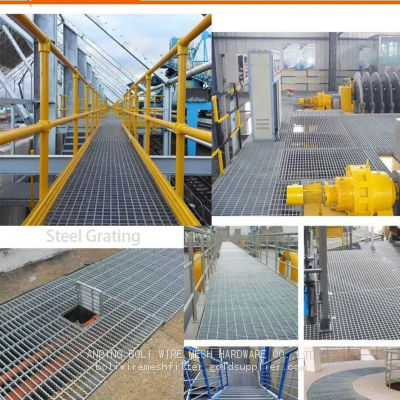 BOLI Steel grating typically consists of parallel and perpendicular steel bars, with the perpendicular bars welded or locked into place by various methods such as welding, riveting, or swaging. The design of the grating allows for the passage of air, light, and liquids while providing structural support.