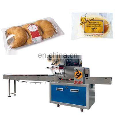 Automatic Sweet Cake Bread Bar Pillow Packing Machine For Croissant Bread Packaging Machine Bread Roll Packing MachineProducts DescriptionThe JK-B model flow packing machine features quick, easy changeover and adjustment that minimizes product and film waste and reduces maintenance costs.The machine working starts with a cylindrical roll of film. The flow wrapping machine will transfer the film from the roll and through to the forming collar (sometimes referred to as tube or plow). At the same time, a conveyor has lined up individual products for wrapping. The film is fed through the collar and the product is surrounded with film, sealed and the film is then cut. The finished individual product is then gathered downstream to be bagged or cartoned prior to boxing and palletizing.Automatic flow packing machine is a widely used packing machine. Suitable for all kinds of product packaging. Including medical supplies, vegetables and meat, baked bread, snacks and candy, daily necessities, hardware accessories, etc.Main Features1.Dual frequency conversion control, Bag length can be set and cut in one step, saving time and film.2.Interface features easy and quick setting and operation.3.Self failure diagnosis, clear failure display.4.High sensitivity photoelectric eye color tracing, numerical input of cutting sealing position for extra accuracy.5.Temperature independent PID control, more suitable for packaging different materials.6.Positioned stop function, without sticking knife or wasting film.7.Simple driving system, reliable working, convenient maintenance.8.All control is realized through software, easy for function adjusting and technical upgrade.Machine Working Process1st step: Put the packaging film on the holder and wear the film as required.2nd step: Setting the parameters you want by touch screen.3rd step:Put the materials to be packed on the conveyor belt4th step: The bag former will make the bag automatically.5th step: The horizontal and vertical cutter device will seal the middleand of the bag.6th step: You will get the nicely paper or plastic bag type.Why Choose UsJIKE BEE MACHINERY has a professional team to provide customers with various packaging solutions. Fully understanding the needs of customers,engineers design the most suitable solution. We have our own processing and assembly workshop and quality inspection and debugging process to ensure the quality of the machine. After acceptance by the customer, they are packed in international standard wooden cases and shipped.We will package the machine's instruction manual and a USB flash drive with machine operation videos together with the machine.Ensure that you can use the machine as soon as you receive it. If you have something you don't understand, our after-sales team will also help you answer in time.Our customers have covered more than 80 countries around the world.And give us unanimous praise.Company ProfileFoshan Jike Bee Automation Equipment Co., Ltd. is a manufacturer of automatic packaging equipment.We are a production-oriented enterprises focused on product innovation, factory direct sales and perfect after-sales service in one.The automatic packaging equipment for granule, powder, liquid and sauce produced by the JKMF company is at the advanced level of the industry,it can be customized production automatic material packaging line for all kinds of products .Mainly applicable to: food, hardware, drugs, daily chemicals, pesticides, fruits and vegetables, cosmetics, other industries.The company has its own patent and product technical certification, which can bring customers high quality equipment and worthy of customer trust.CertificationsFAQQ1:Do you have manual or operation video for us to know more about the machine? Yes, not only manual or operation video, 3D drawing also available to make as per your design,also the video we can make of testing the material from our packaging machine if your packing goods easier for us to find from our local market. Q2:How can I trust you for the first time business ?Please note our above business license and certificate. And if you don't trust us, then we can use Alibaba trade assurance service, guarantee your money, and guarantee your machine's on-time delivery and machine quality.Q3:Is engineer available to serve oversea?Yes, but the travel fee is paid by you. So actually to save your cost, we will send you a video of full details machine installation and assist you till the end.Q4:How can we make sure about the machine quality after we put the order?Before delivery, we will send you the pictures and videos for you to check the quality, and also you can arrange for quality checking by yourself or by your contacts in China.Q5:Will you provides the door to door service?Yes. Please offer us your final destination, we will check with our agent to see if it available, and most of the area is ok for us to clearing and sending in your countries.